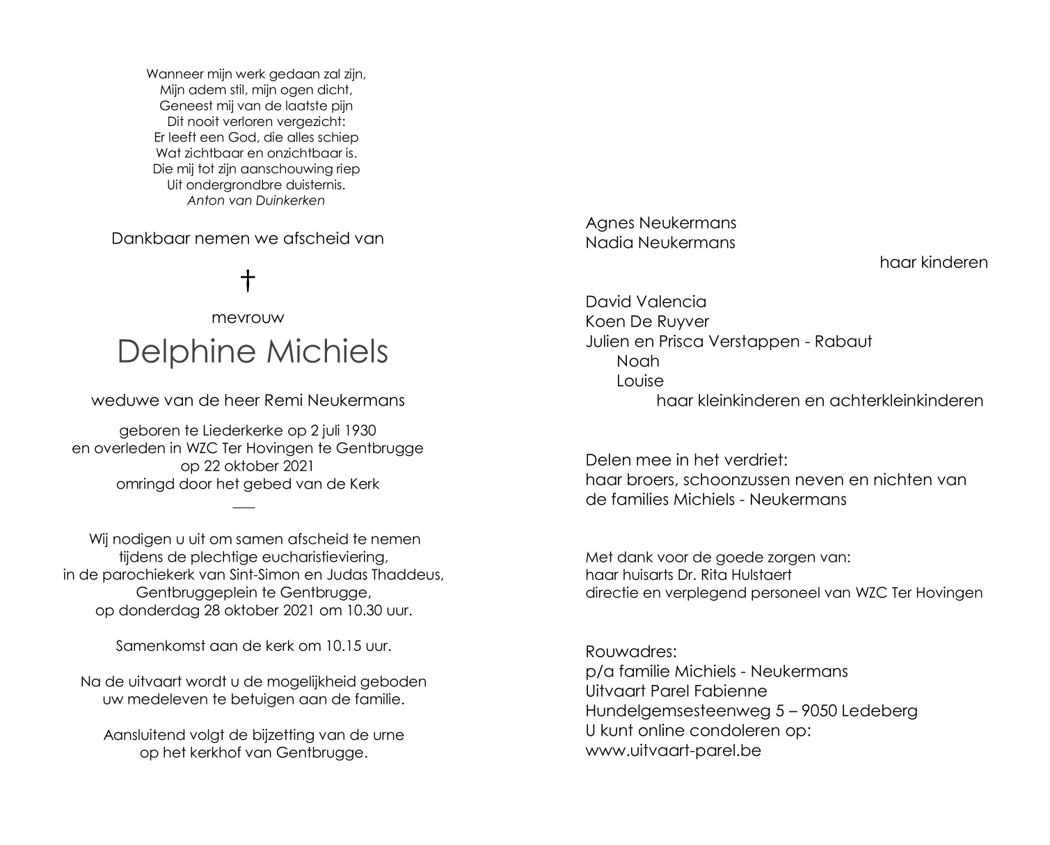 Overleden te Gentbrugge (9050) op vrijdag 22 oktober 2021 op 91-jarige leeftijd