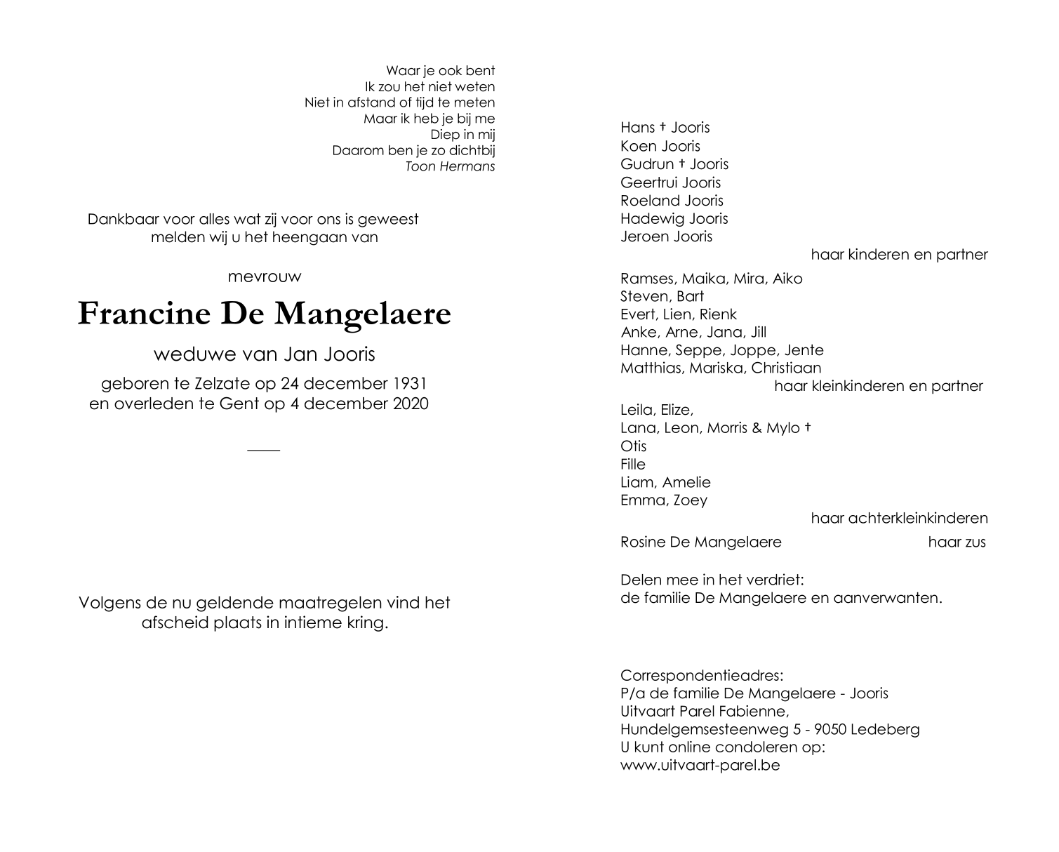 Overleden te Gent (9000) op vrijdag 4 december 2020 op 88-jarige leeftijd