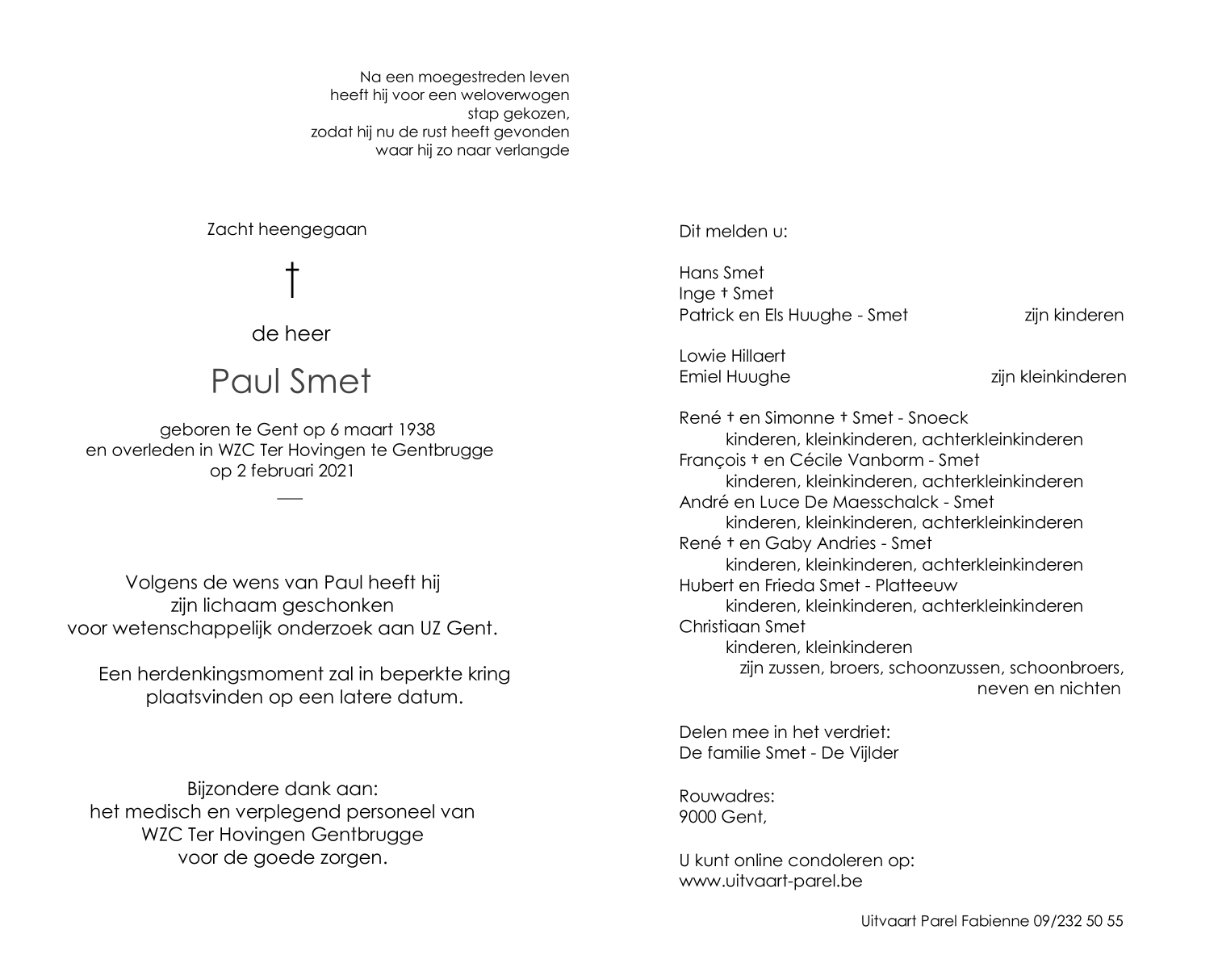 Overleden te Gentbrugge (9050) op dinsdag 2 februari 2021 op 82-jarige leeftijd