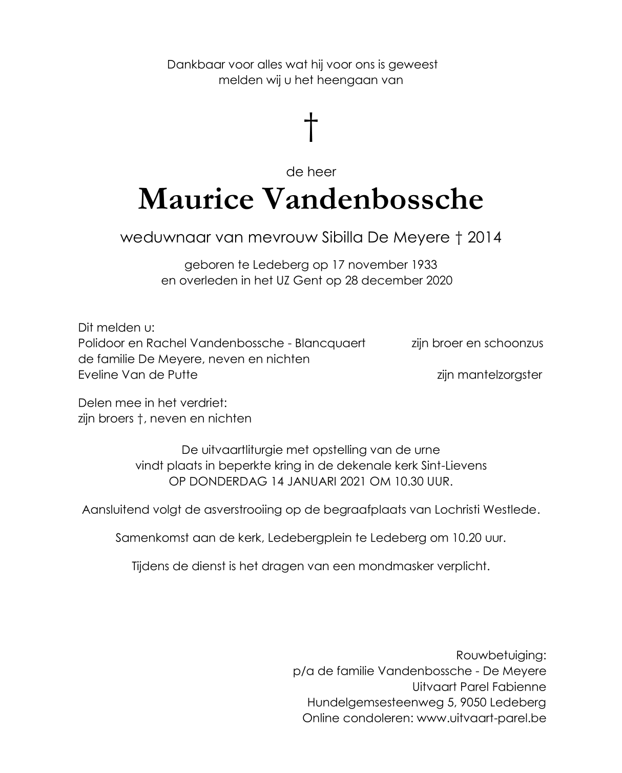 Overleden te Gent (9000) op maandag 28 december 2020 op 87-jarige leeftijd
